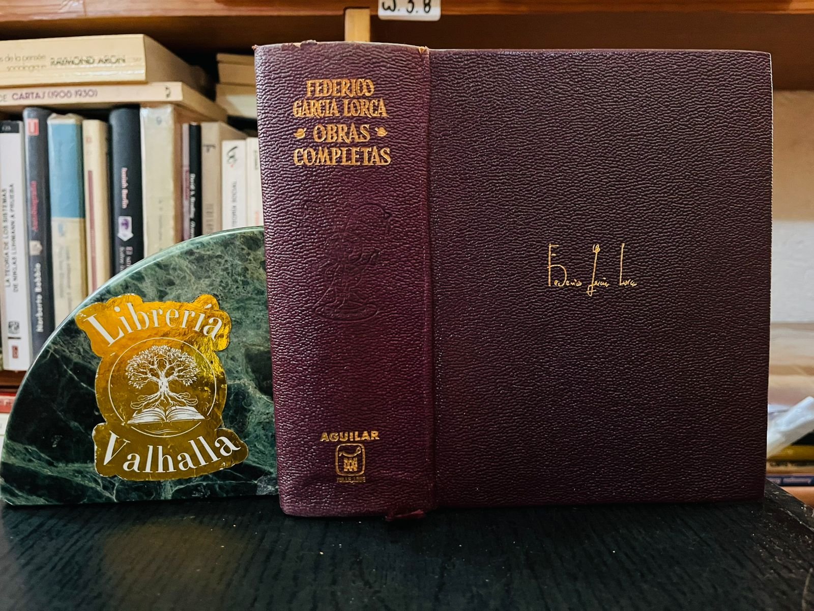 Volumen que recopila la obra de Federico García Lorca (poesía, teatro, prosa), con prólogo de Jorge Guillén y epílogo de Vicente Aleixandre, en la clásica edición de plena piel y papel biblia de Aguilar.
